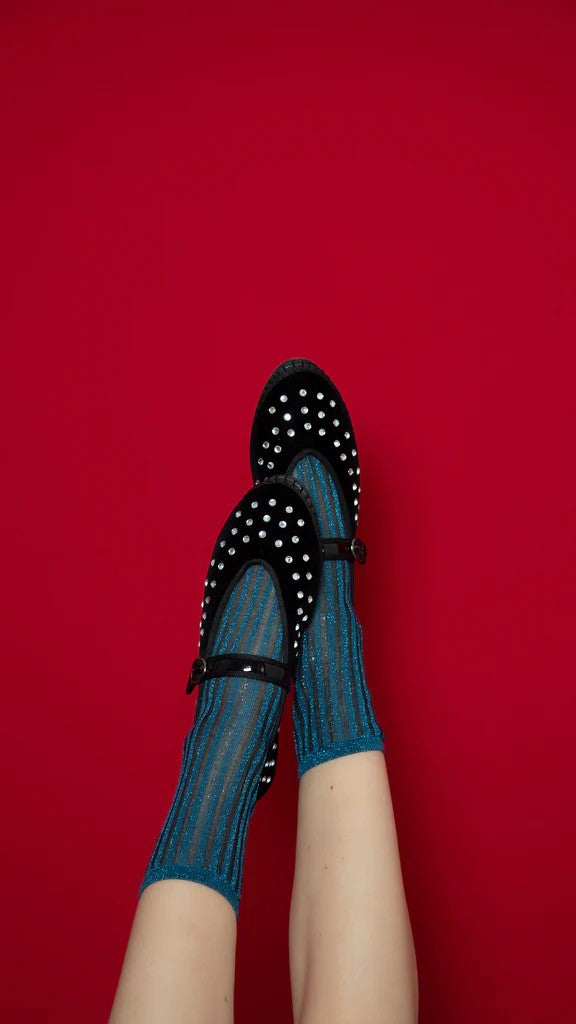 Bailarina de terciopelo con escote en V en negro con ribetes negros y tachuelas de cristal.
