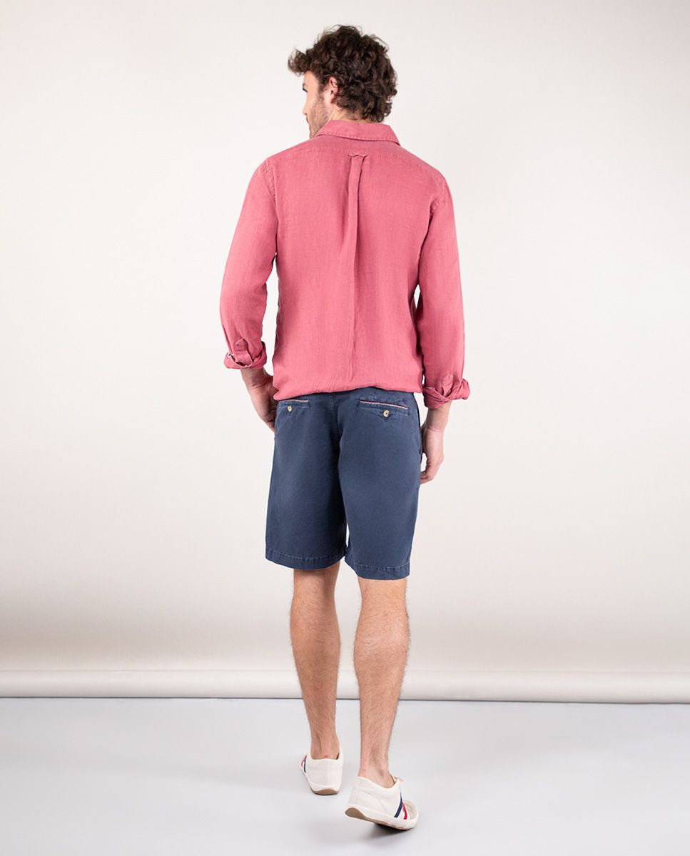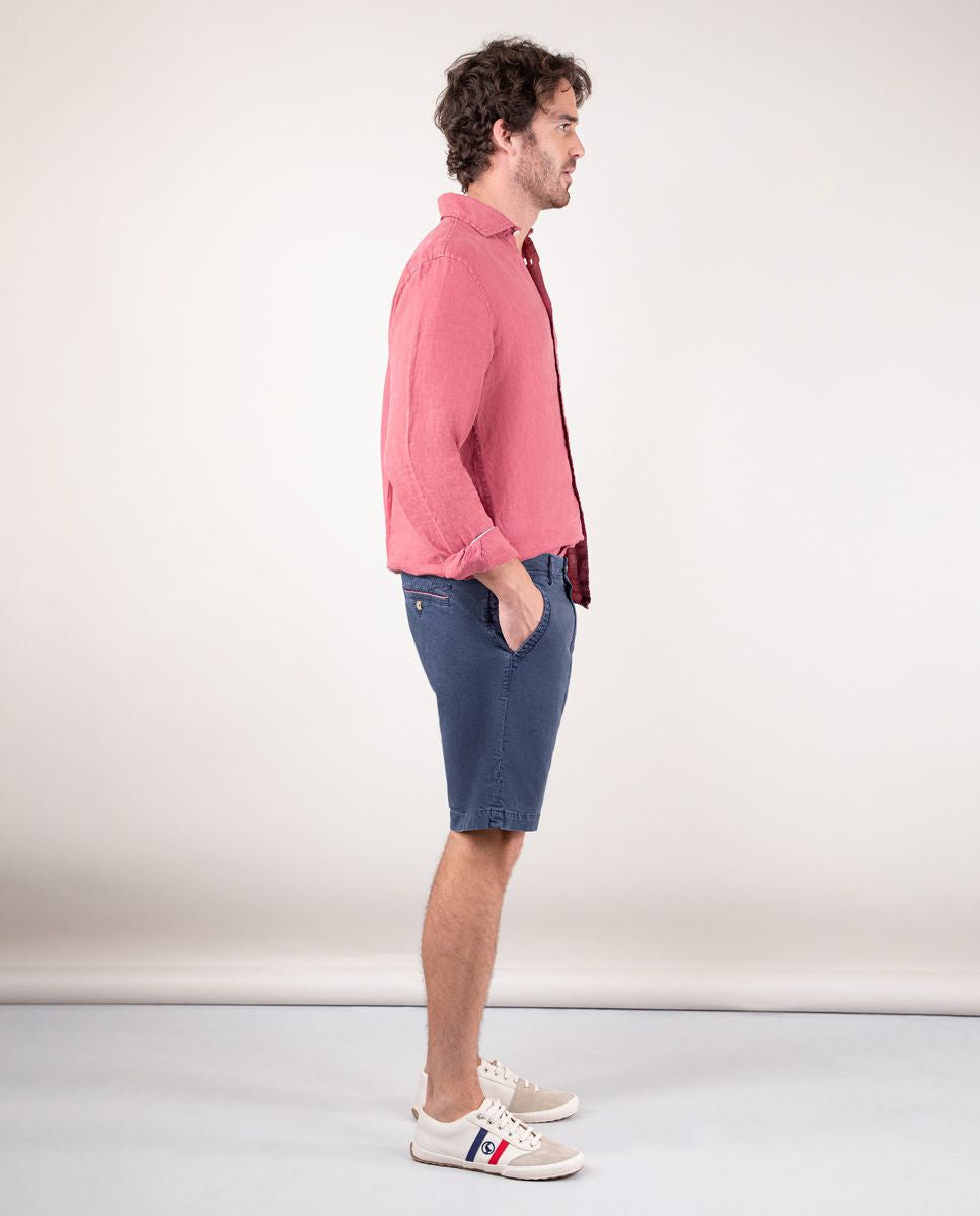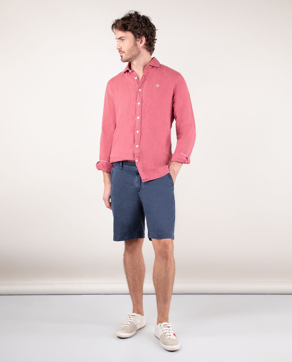 Bermuda de hombre lisa. Corte Regular Fit, cierre mediante cremallera oculta por tapeta y botón. Tiene dos bolsillos laterales y bolsillos traseros con cintas insertadas. Trabillas para el cinturón y tiene el chapón del logo cosido encima del bolsillo trasero. Esta prenda ha sido tratada con un tinte pigmentario consiguiendo un color desgastado.
