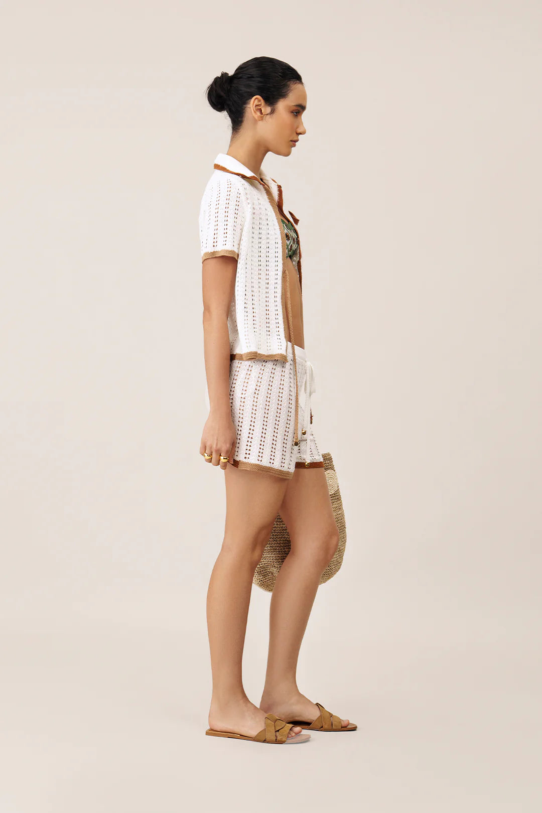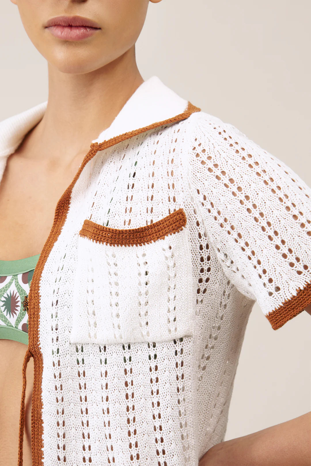 Esta camisa esta confeccionada en un tejido de punto calado de color blanco, ideal para el clima cálido. Es manga corta y tiene un cuello tipo polo. Los bordes de las mangas, el cuello y el cierre frontal están ribeteados en un color marrón, lo que le da un toque de contraste y define la silueta. La camisa tiene un cierre frontal con botones. Por su tejido ligero y diseño veraniego, sería perfecta para llevar sobre un traje de baño o con unos shorts para un look casual y fresco.