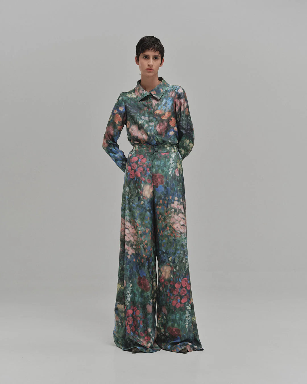 Camisa de sarga de seda con corte holgado, cuello en punta y tapeta con botones ocultos. La caída fluida de la tela realza su diseño abstracto y pictórico.