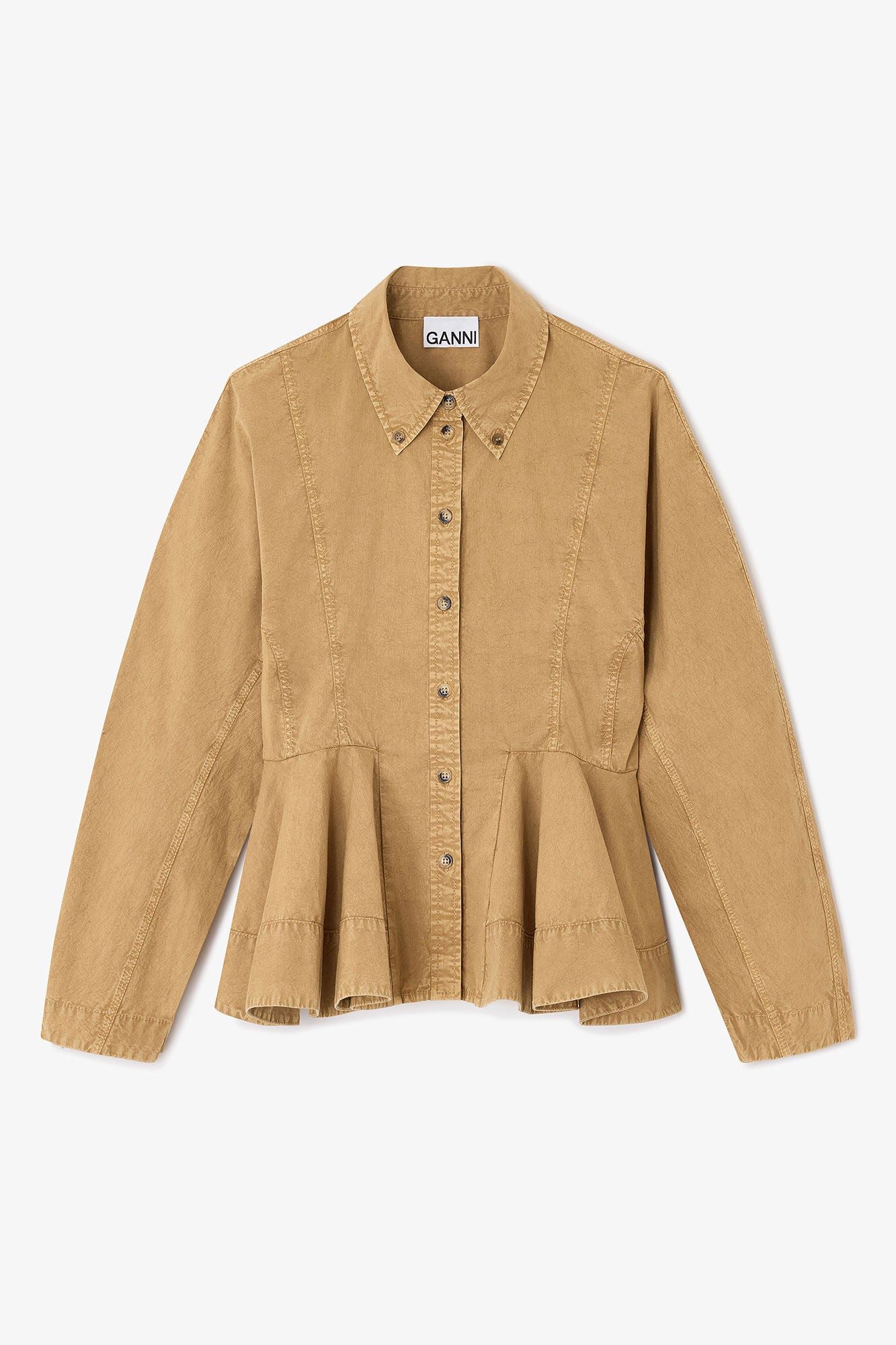 Camisa con cuello abotonado clásico, cierre con botones en la parte delantera, mangas curvas y una silueta peplum.