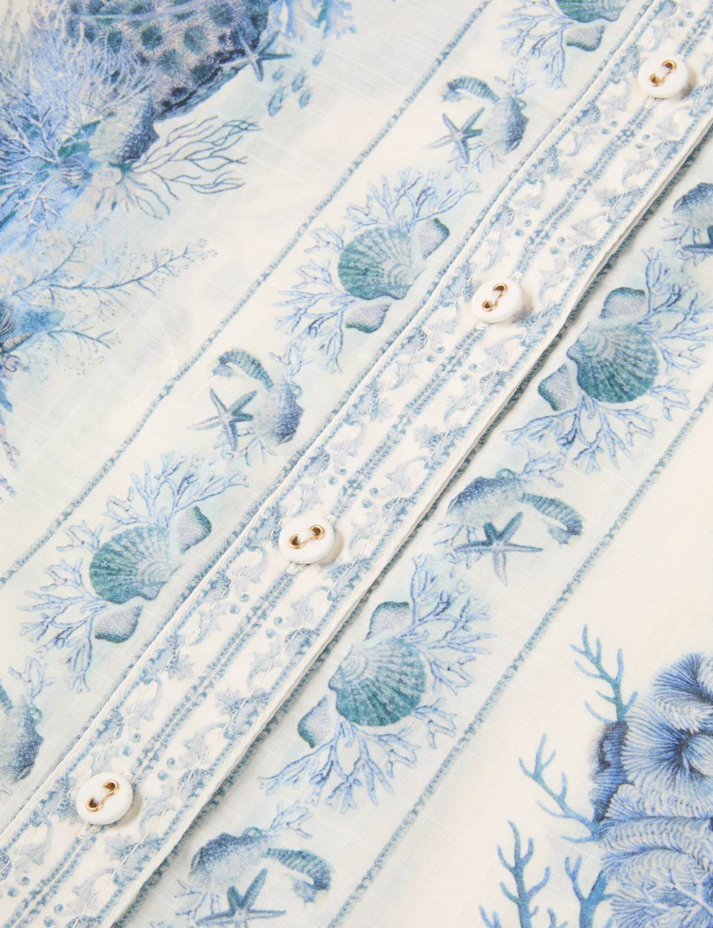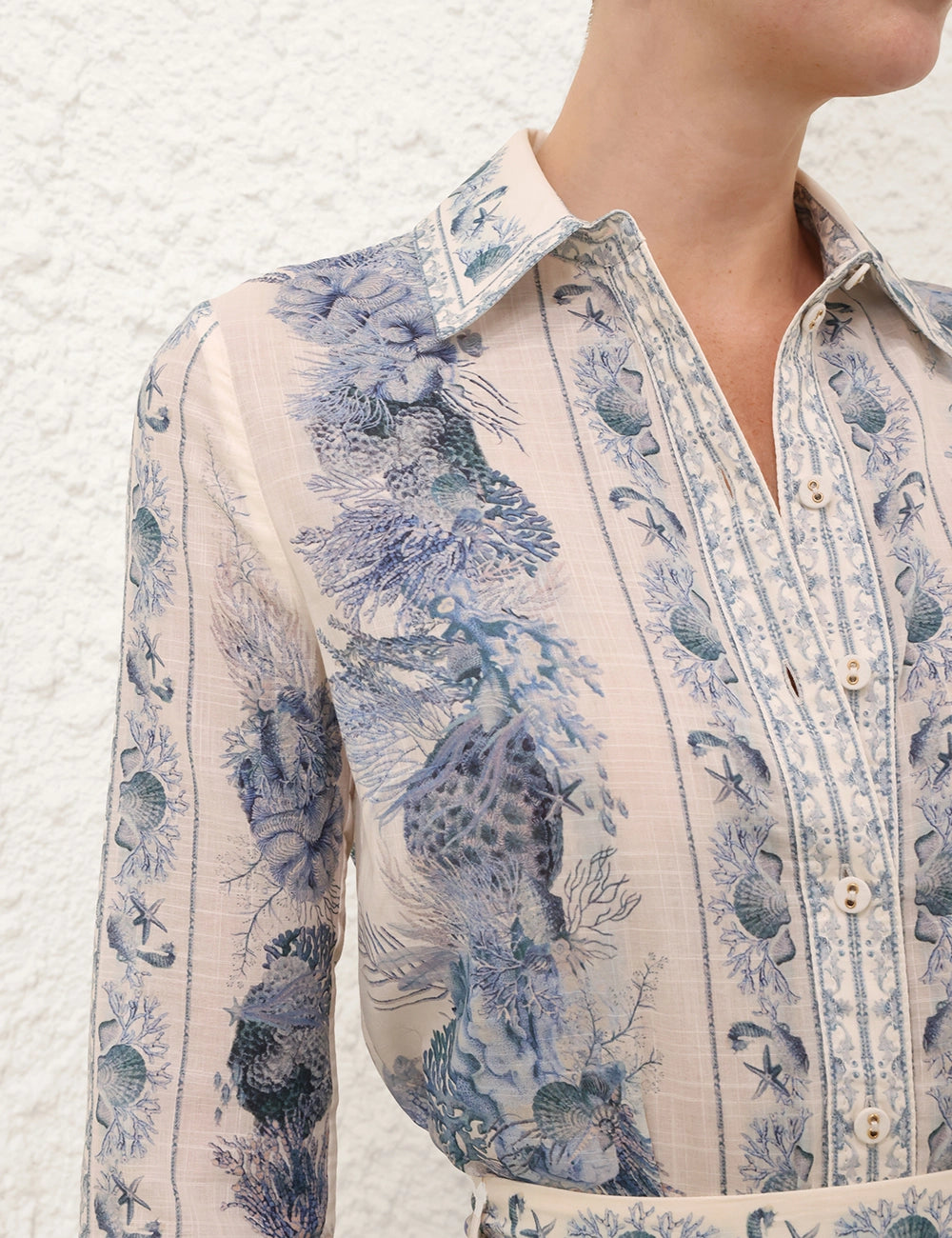 Body Wanderlust en azul toile de nuestra colección Resort Swim 2026. Una camisa de algodón con cuello clásico, mangas largas y ajustadas, rematada con botones en el centro delantero y en los puños.