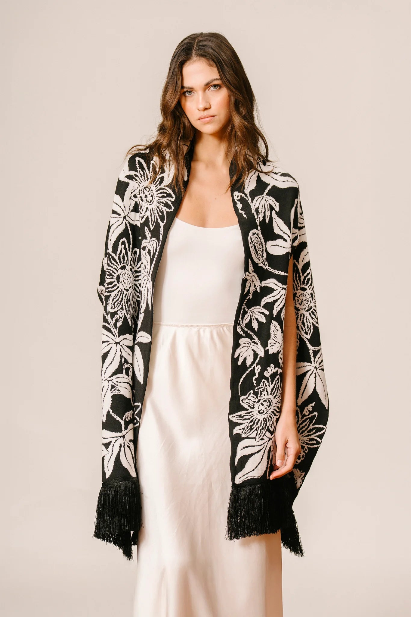 El Chal Passiflora Negro es una prenda muy versátil que, gracias a la apertura en el centro tiene varias formas de uso y además, es doble faz. Tiene un estampado de la planta trepadora de gulupa perteneciente a la familia Passifloraceae. Lleva un hueco en uno de los costados para meter el brazo y usarlo de varias formas