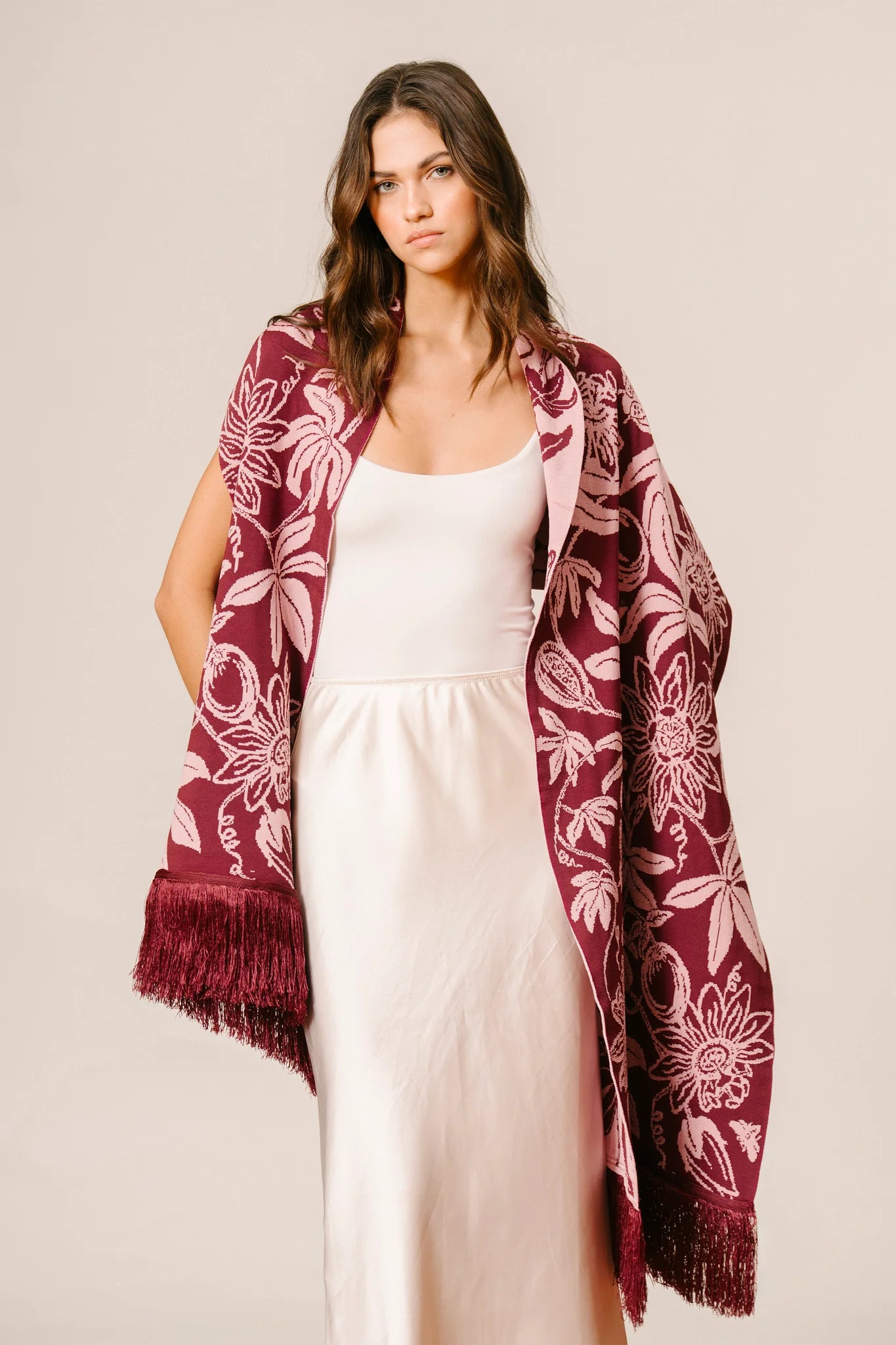 El Chal Passiflora Vino es una prenda muy versátil que, gracias a la apertura en el centro tiene varias formas de uso y además, es doble faz. Tiene un estampado de la planta trepadora de gulupa perteneciente a la familia Passifloraceae. Lleva un hueco en uno de los costados para meter el brazo y usarlo de varias formas