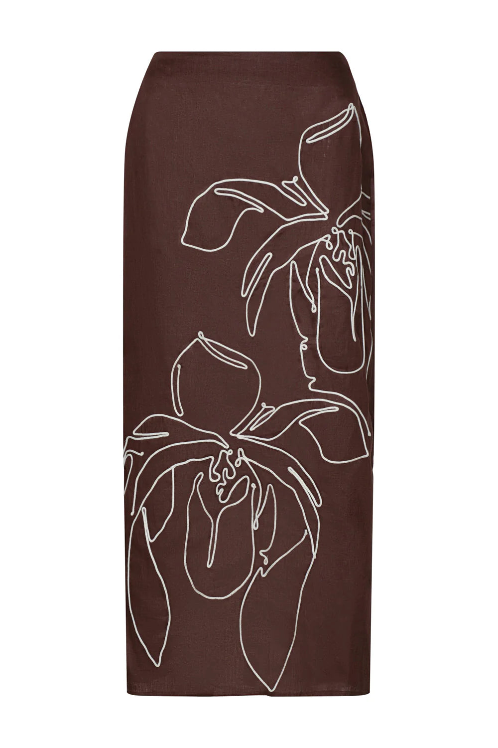 Falda arabela coffee. Diseñada para destacar, esta falda elaborada en 100% lino combina elegancia natural con una silueta contemporánea. Su corte largo y limpio se complementa con un bordado en contraste que aporta carácter y originalidad a cada paso.
