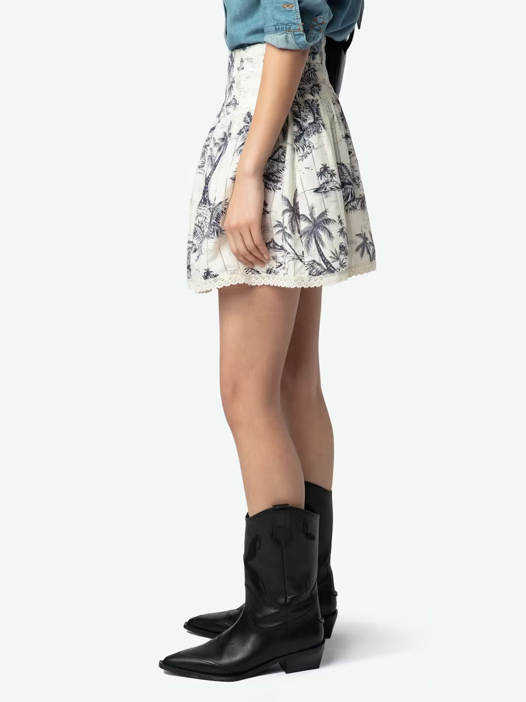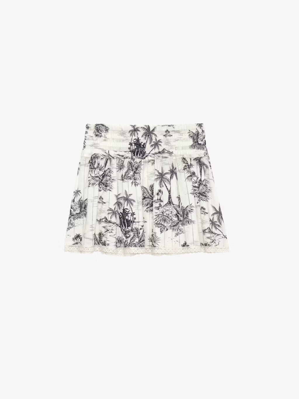 Falda corta de algodón estampado con cintura elástica e inserto de encaje de escalera.