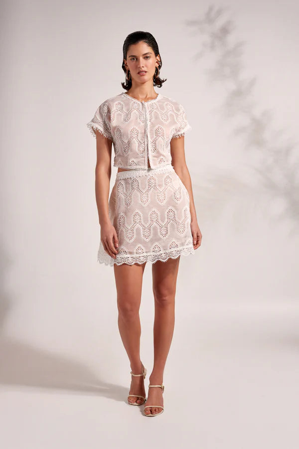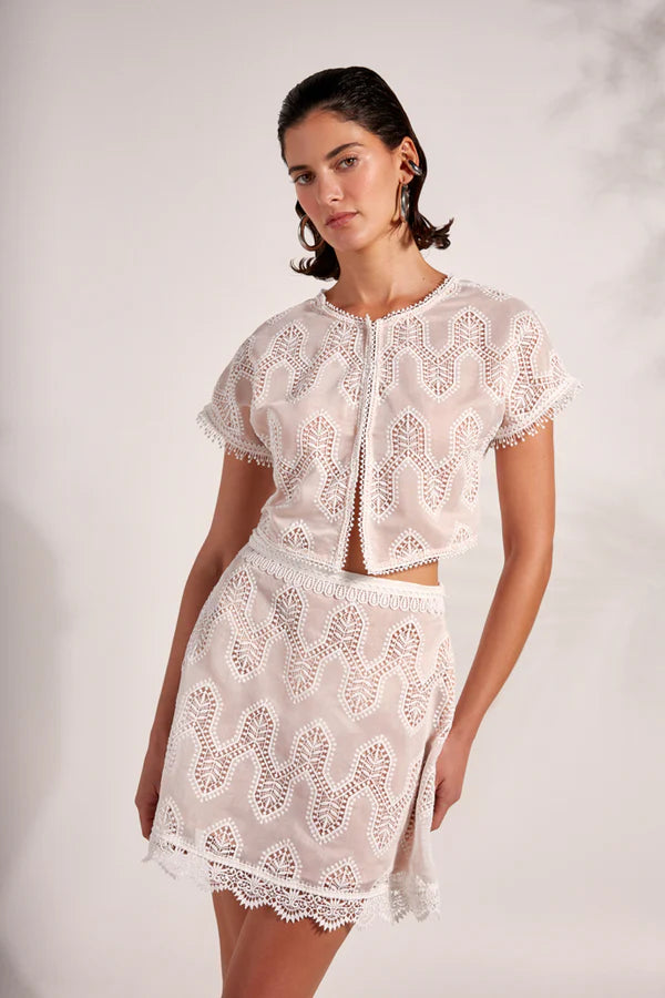 Minifalda de silueta de línea A, con cintura adornada con ribetes de encaje.