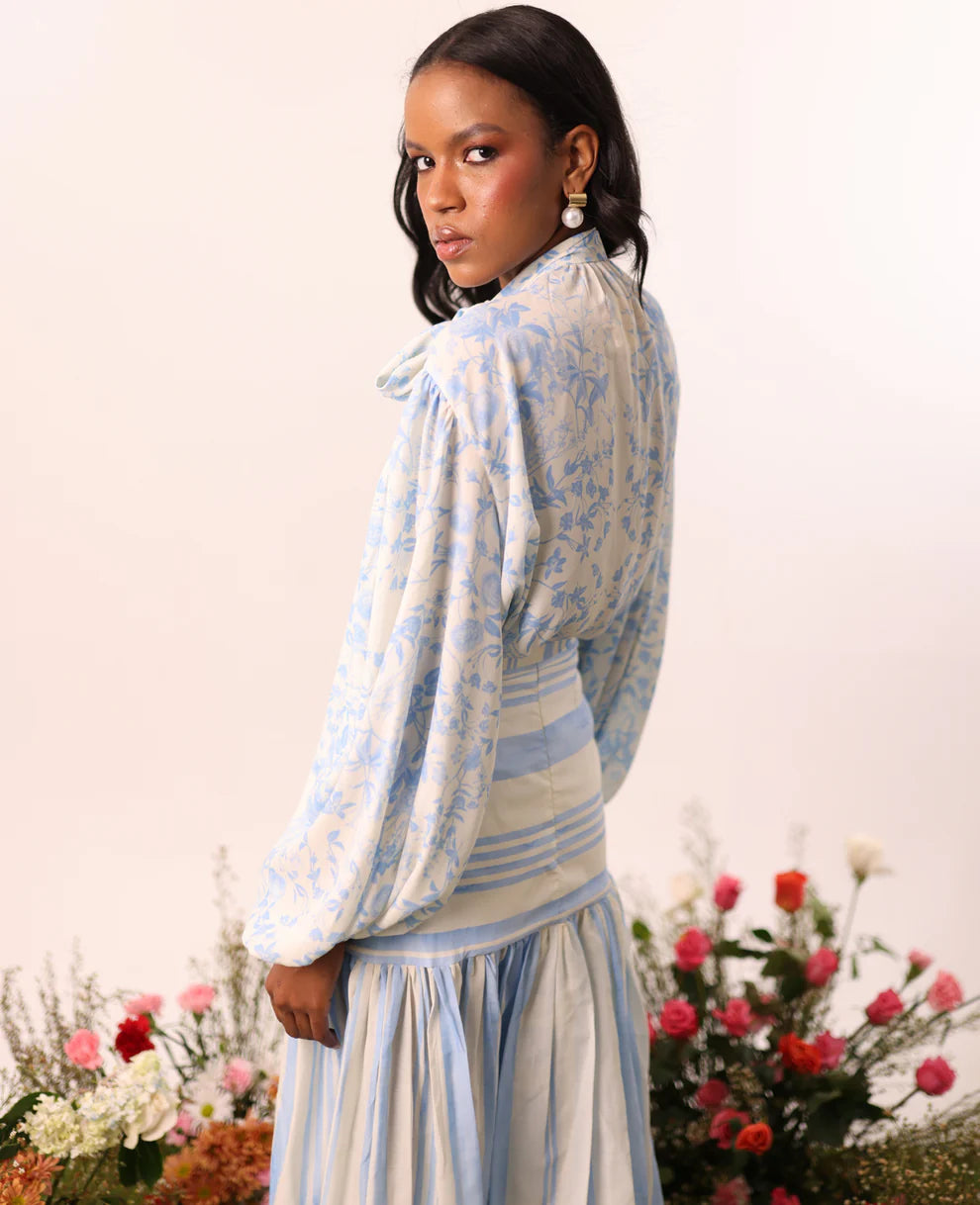 Falda larga de corte semi ajustado, con un cinturón adornado con delicadas flores del mismo tejido y dispuestas en un patrón disperso. Su diseño se completa con un volante asimétrico en el bajo, que aporta movimiento y un toque femenino y distintivo.