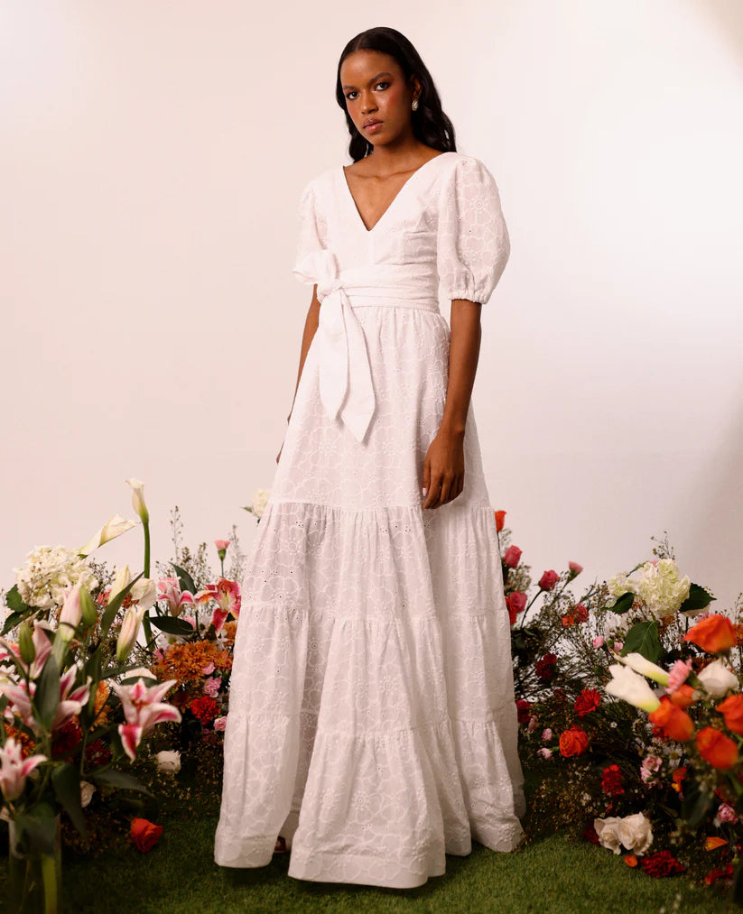 Vestido largo con escote en V y mangas cortas abullonadas que aportan volumen y elegancia. La cintura se ajusta con un cinturón en forma de V, estilizando la silueta y añadiendo un detalle distintivo al diseño.