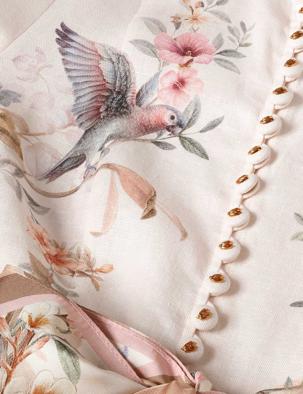 Vestido midi con botones Rebellion en color crema con estampado de aves de nuestra Colección Crucero 2026, Twisted Romance. Vestido midi de lino con mangas largas abullonadas y puños elásticos, botones funcionales en la parte delantera, rematado con un cinturón extraíble tipo pañuelo.
