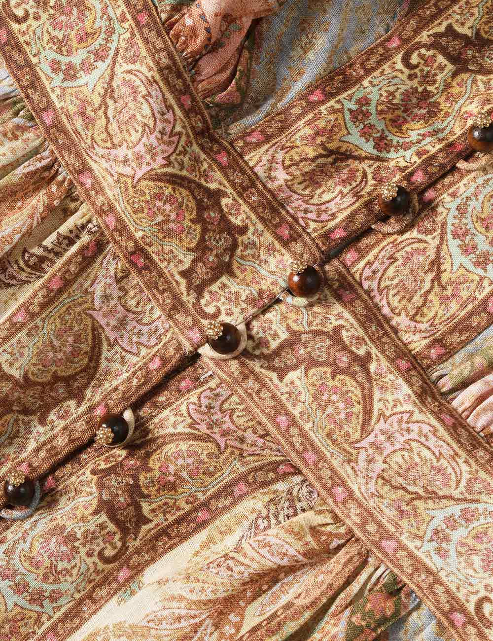 Vestido midi Wanderlust con escote pronunciado en multicolor Tapestry de nuestra colección Resort Swim 2026. Un vestido midi de lino con escote en V pronunciado, mangas largas tubulares con puños elásticos, cinturilla ajustada y falda acampanada.