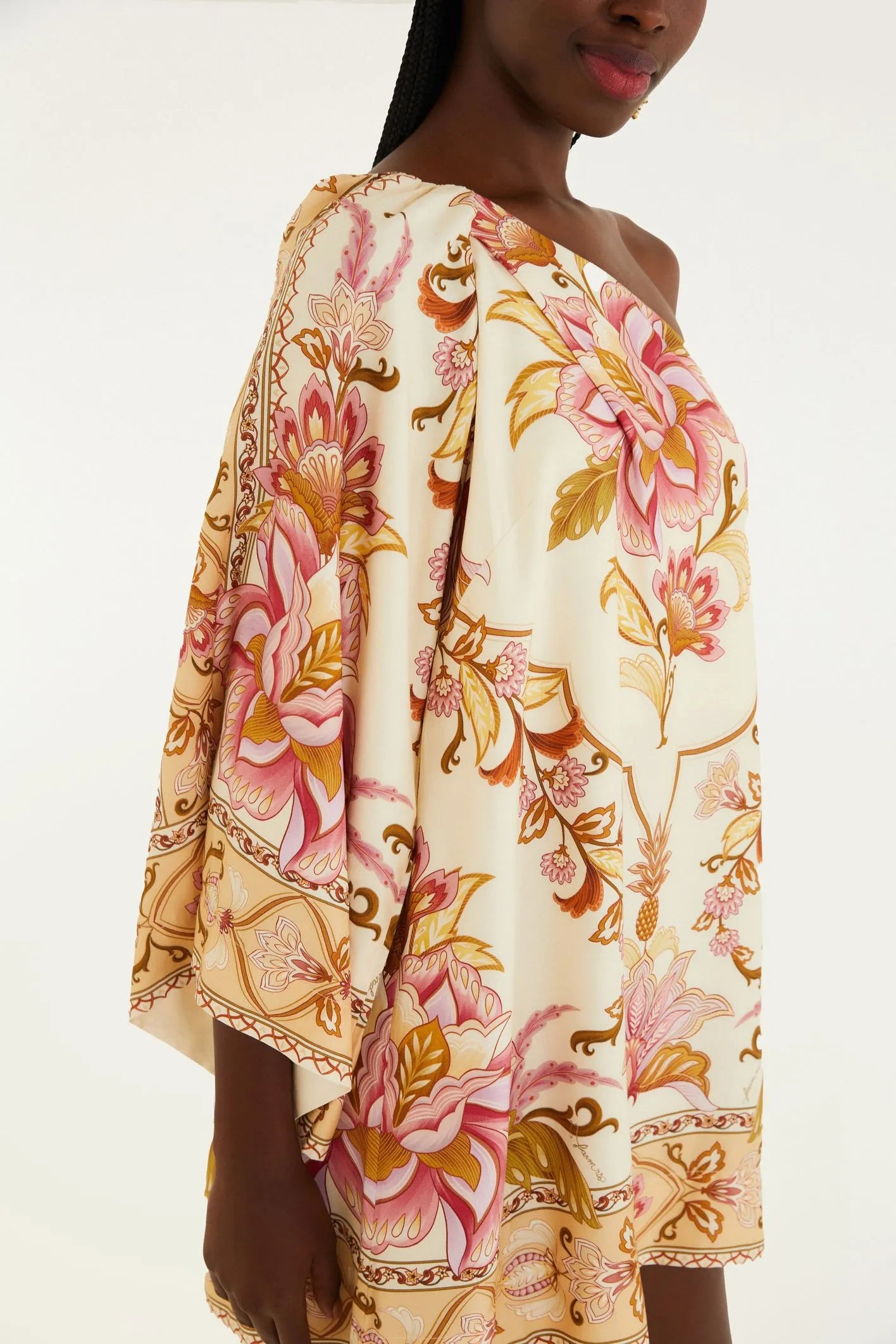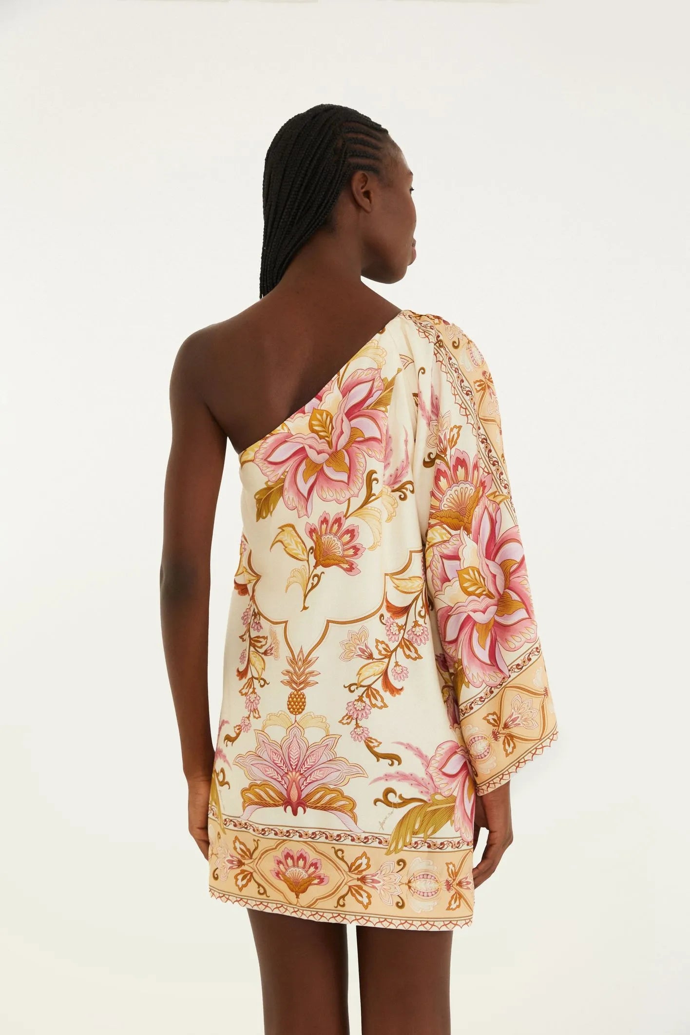 Vestido corto con un majestuoso estampado de jardín. De diseño asimétrico y caída fluida, este vestido crea una silueta ligera y relajada. El diseño de un solo hombro le da un toque moderno y deja un hombro al descubierto, realzando cualquier look. Ideal para eventos informales o reuniones relajadas.