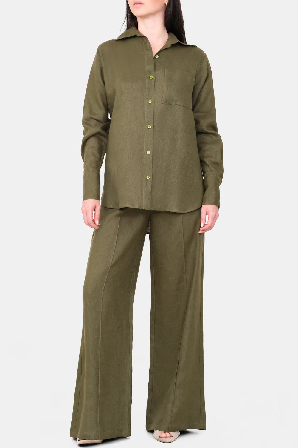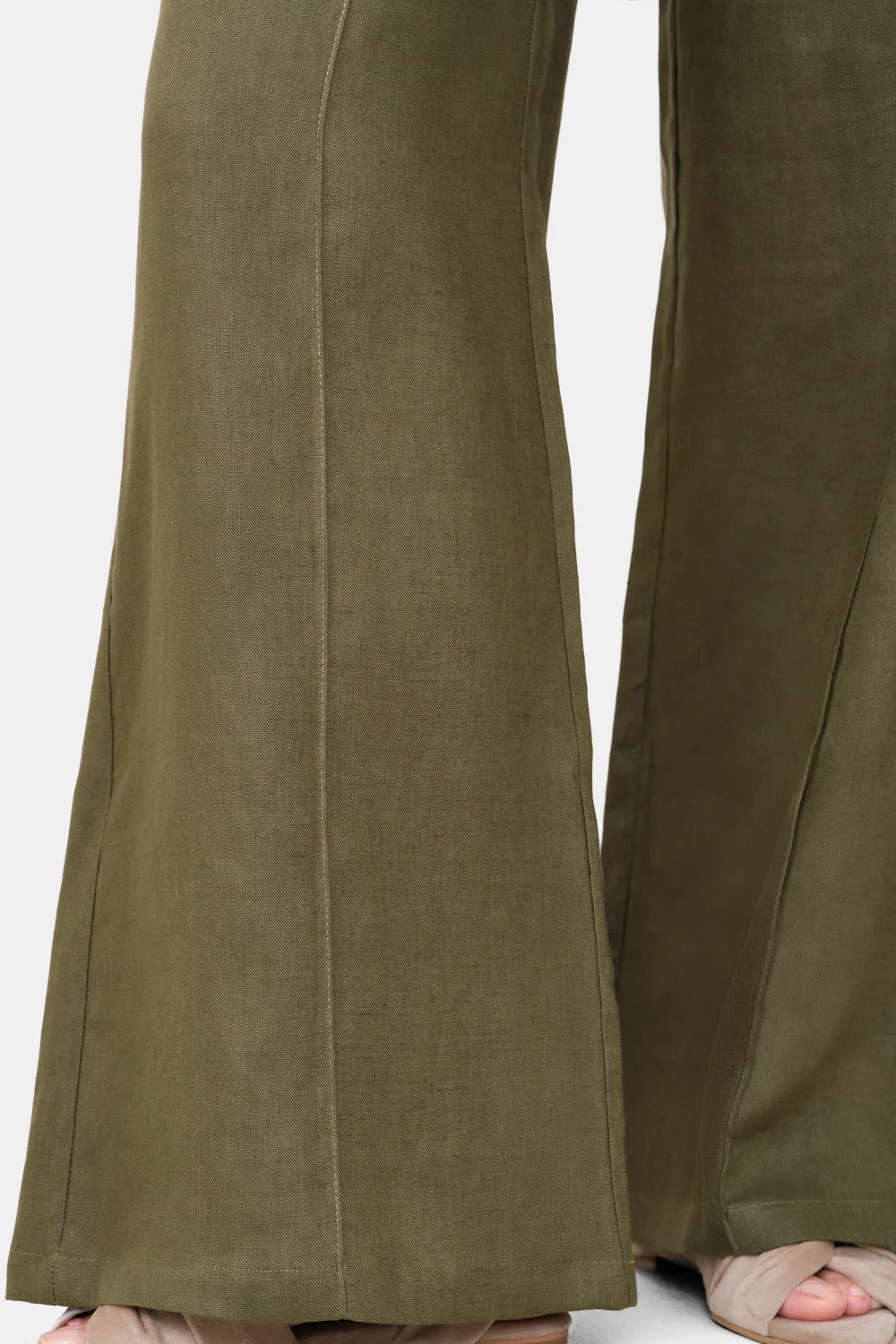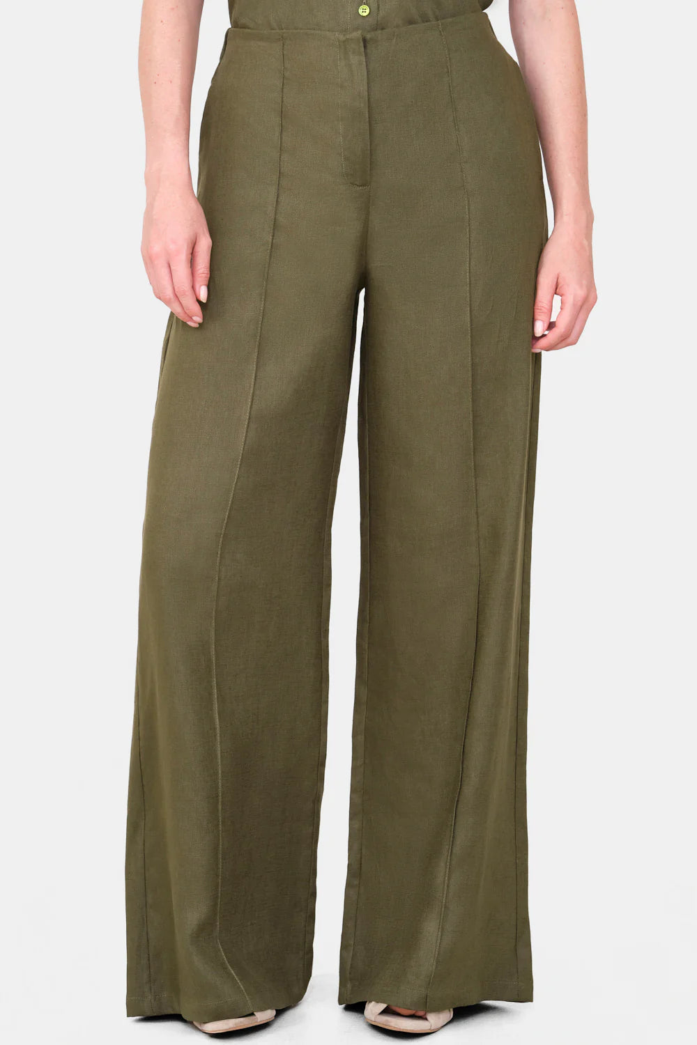 Pantalón Cala verde oliva. Pantalón 100% lino con elastico en la parte posterior lo cual le permite ser ajustable, y vena en el frontal que aporta sofisticación.