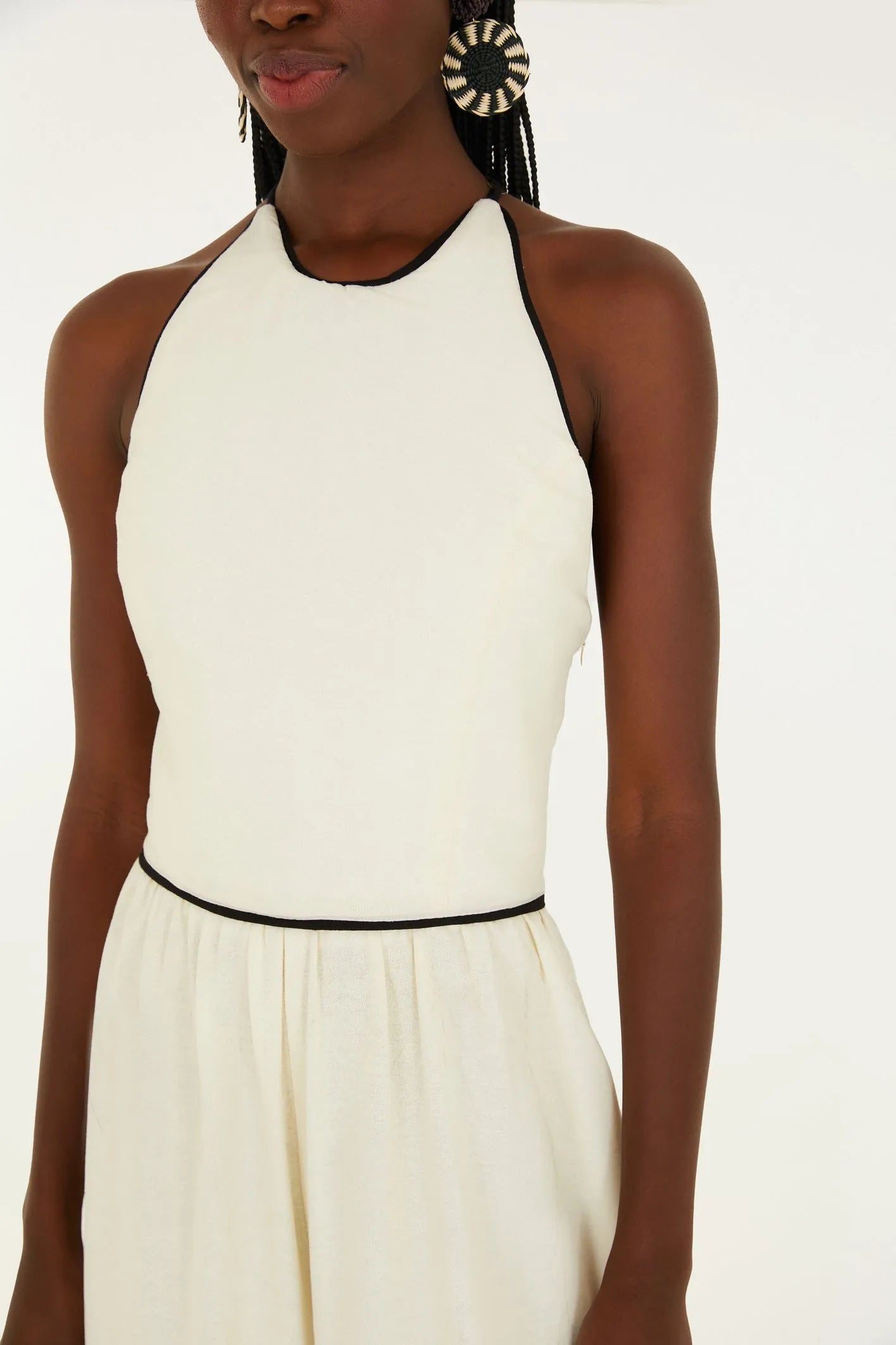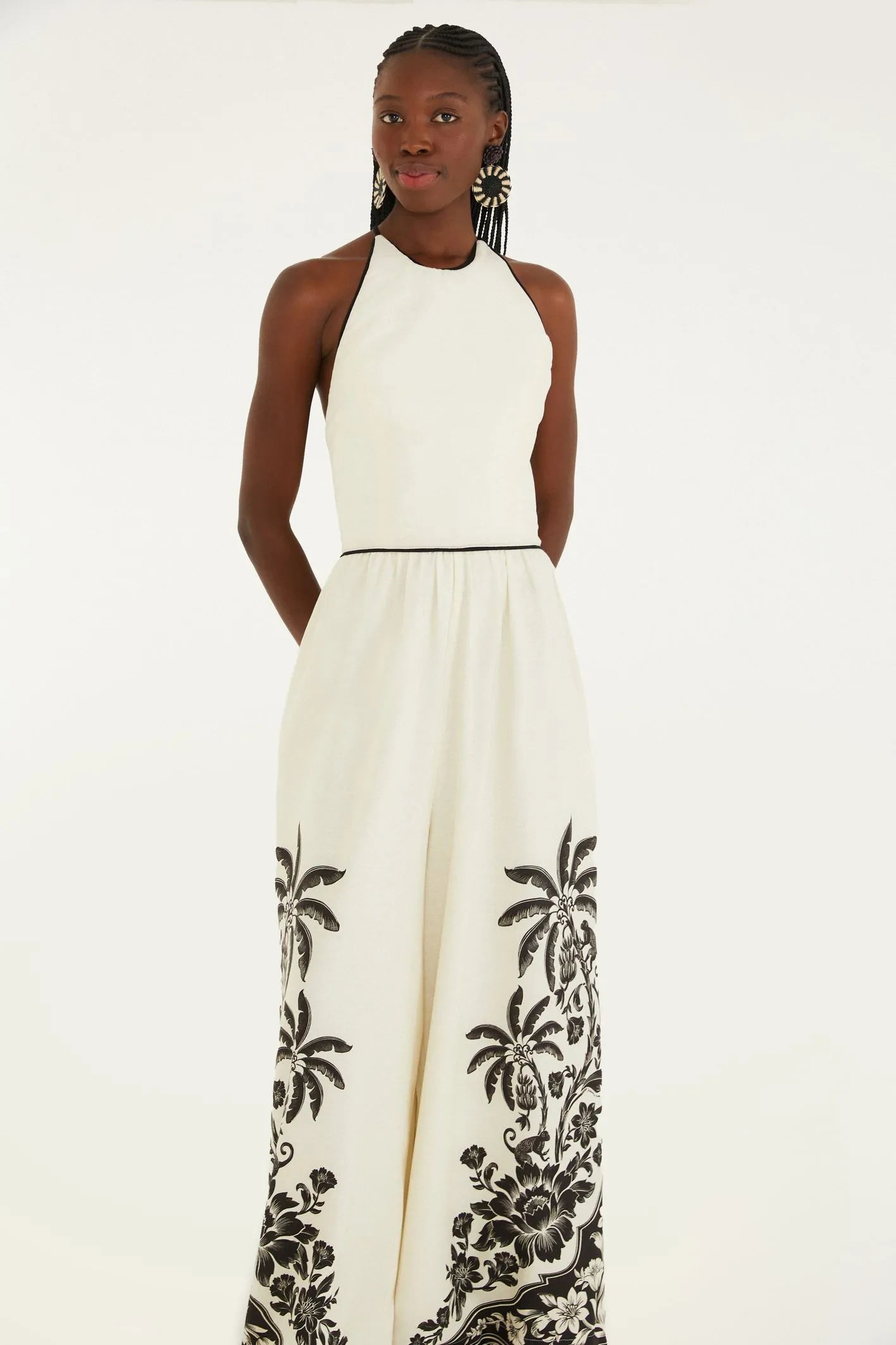 Mono estampado Guanacaste con pantalón de pierna ancha. Presenta un escote halter que realza el busto y un diseño sin mangas que favorece los hombros. La cintura está sutilmente definida, mientras que el pantalón de pierna ancha aporta movimiento y fluidez. Un look ideal para eventos diurnos o salidas informales.