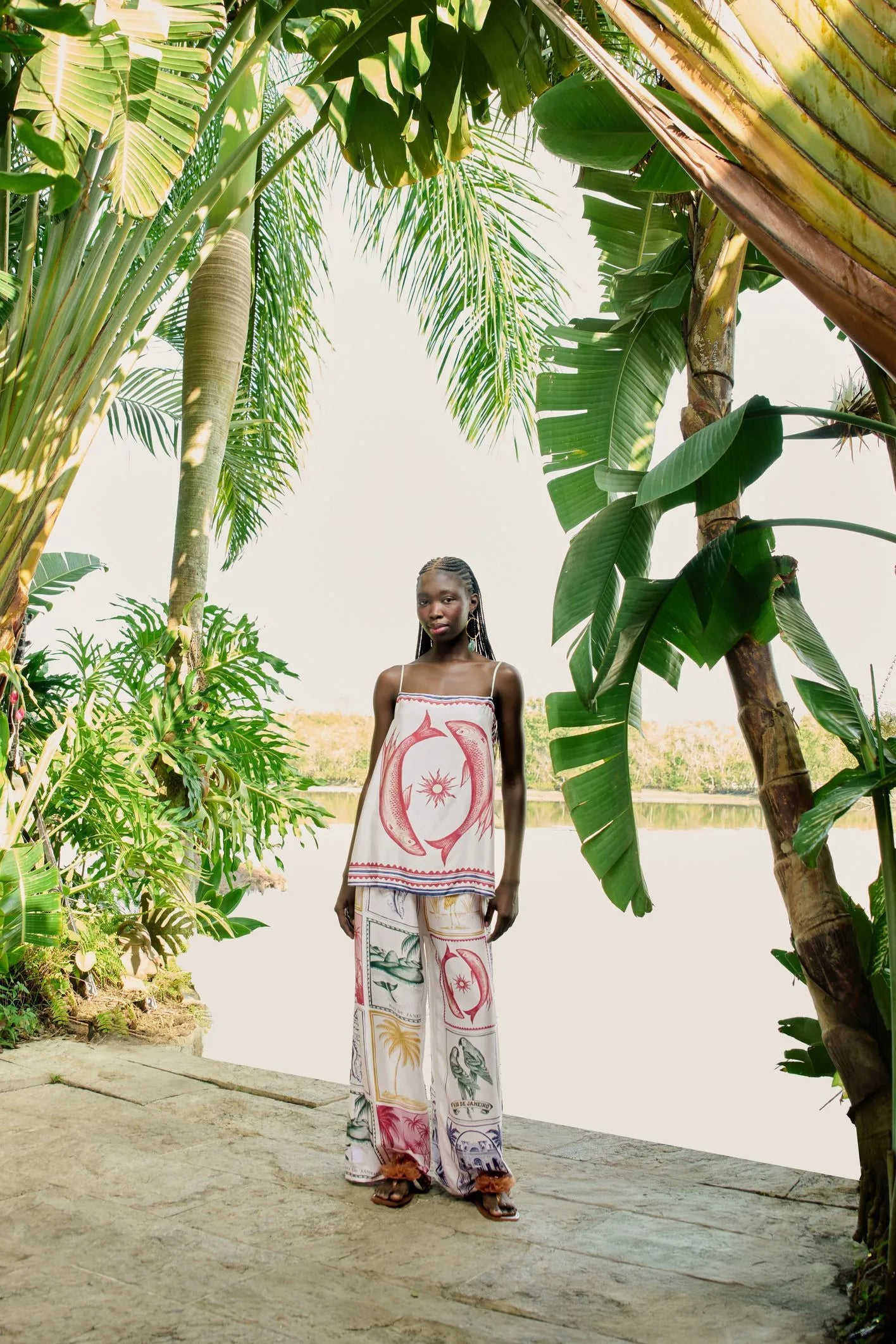 Pantalón palazzo estampado de Brasil, estilo vintage. Esta prenda derrocha originalidad con su corte amplio y cómodo que realza el movimiento. Su tejido ligero y fluido ofrece una caída perfecta, ideal para un paseo informal junto al mar o un día soleado en el parque. Los detalles distintivos en los acabados garantizan un look único.