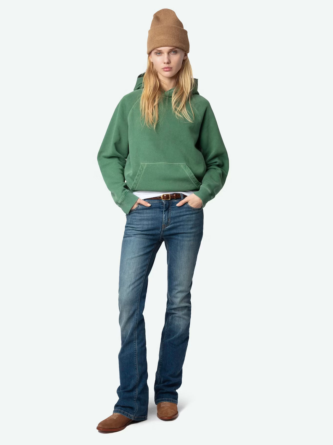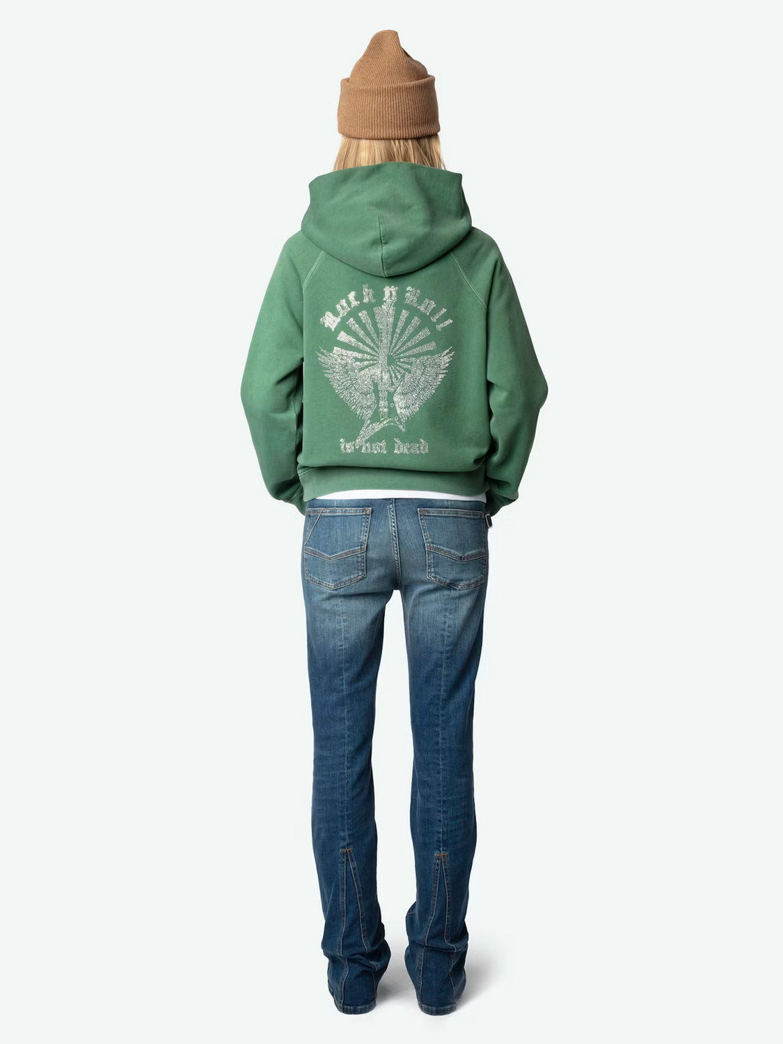 Sudadera de algodón orgánico verde con capucha y estampados de guitarras, y las alas metálicas emblemáticas decoradas con strass en la espalda.