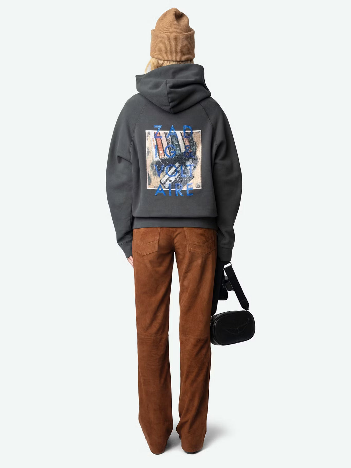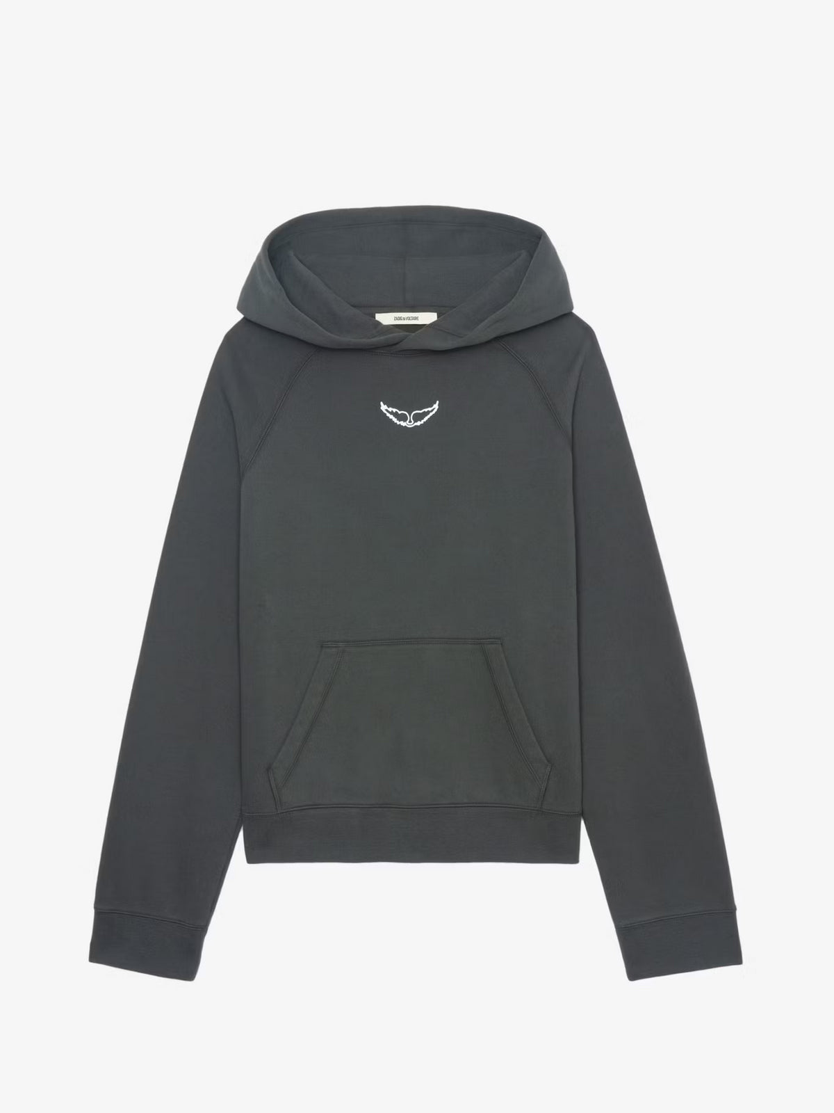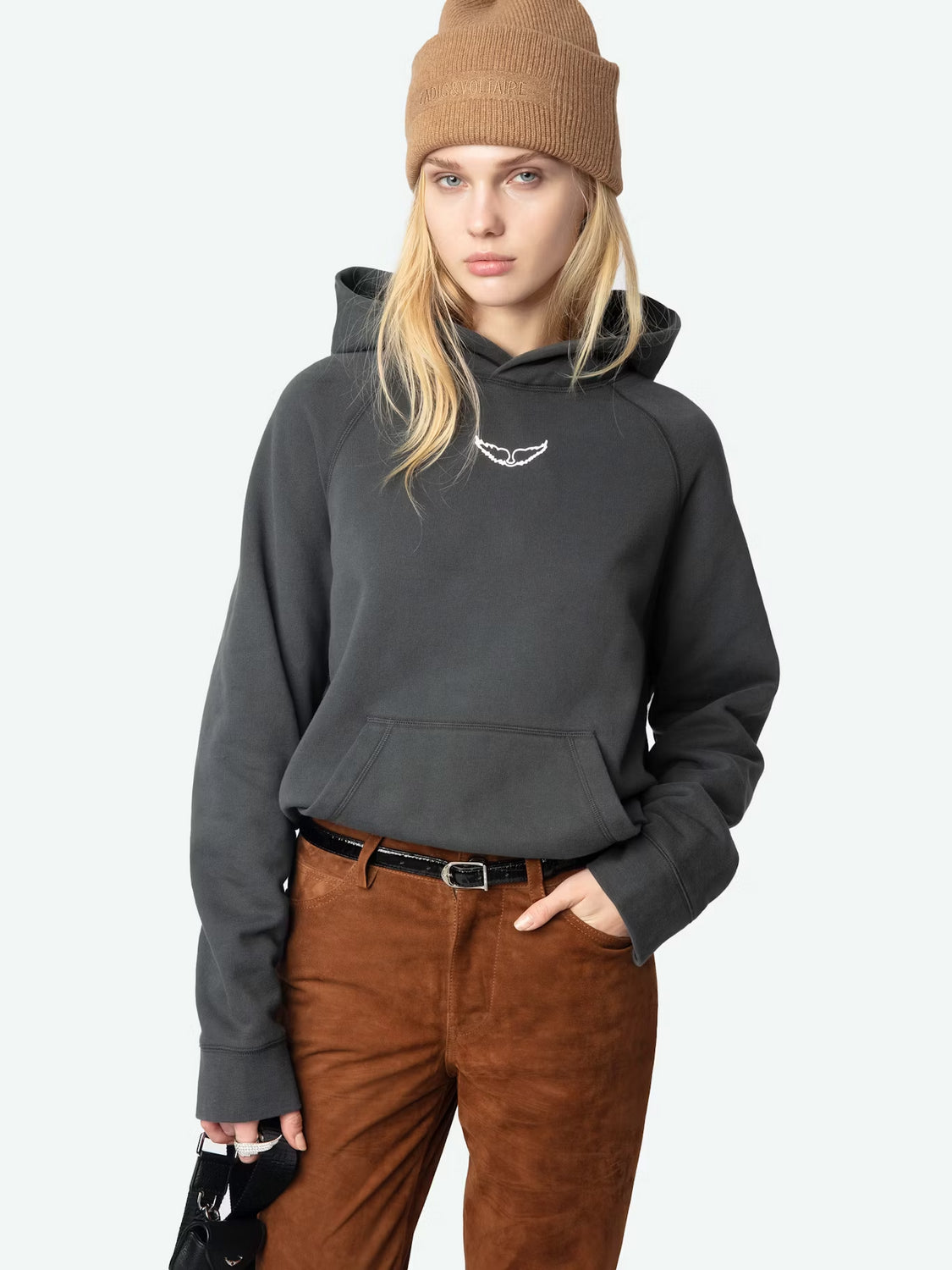 Sudadera de felpa gris oscuro con capucha, con las alas emblemáticas impresas en la parte delantera y fotoprint adornado con pedrería en la espalda.