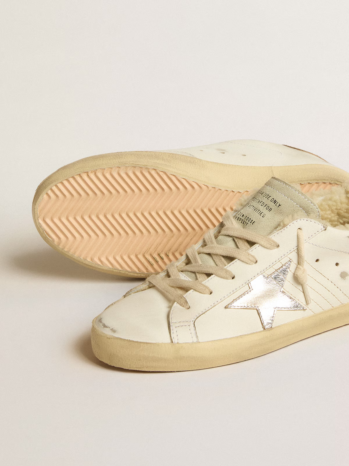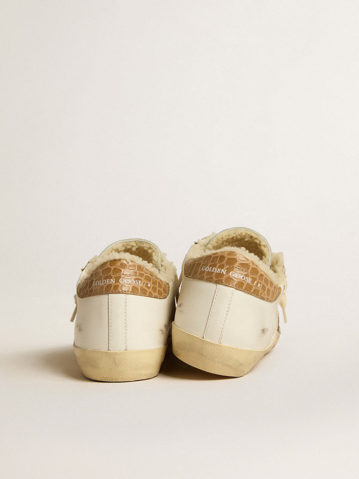Un icono atemporal, pero en continua evolución. En Golden nos encanta reinterpretar nuestros clásicos constantemente, cada vez bajo una luz diferente. Forradas en suave shearling color beige, estas Super-Star de piel blanca se distinguen por su estrella de piel laminada color plateado y su refuerzo del talón de piel con estampado cocodrilo color tabaco. Y como toque final, la lengüeta de ante color gris hielo y los cordones color beige.
