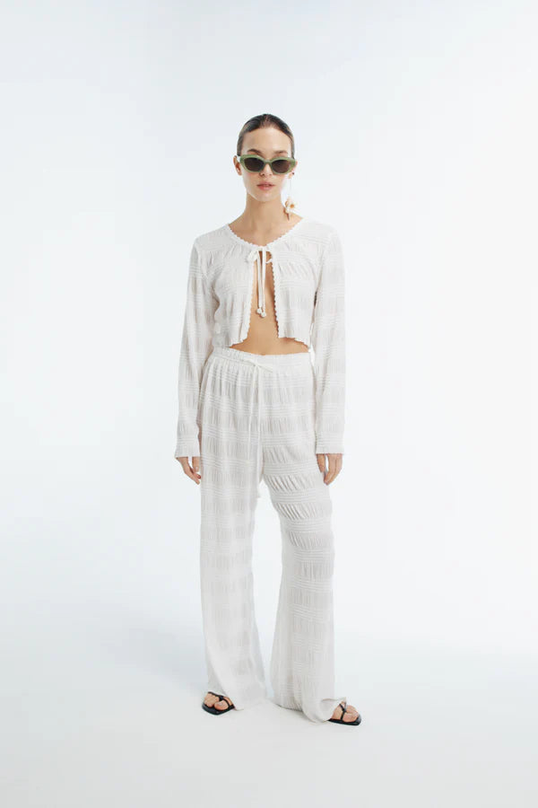 Crop top de manga larga con abertura frontal, que se abrocha en la parte superior del escote redondo con un cordón de amarrar. El cordón está decorado con un adorno redondo de canutillos hechos a mano. El top tiene un delicado borde de encaje en el escote. Hecho en tela de punto con textura.