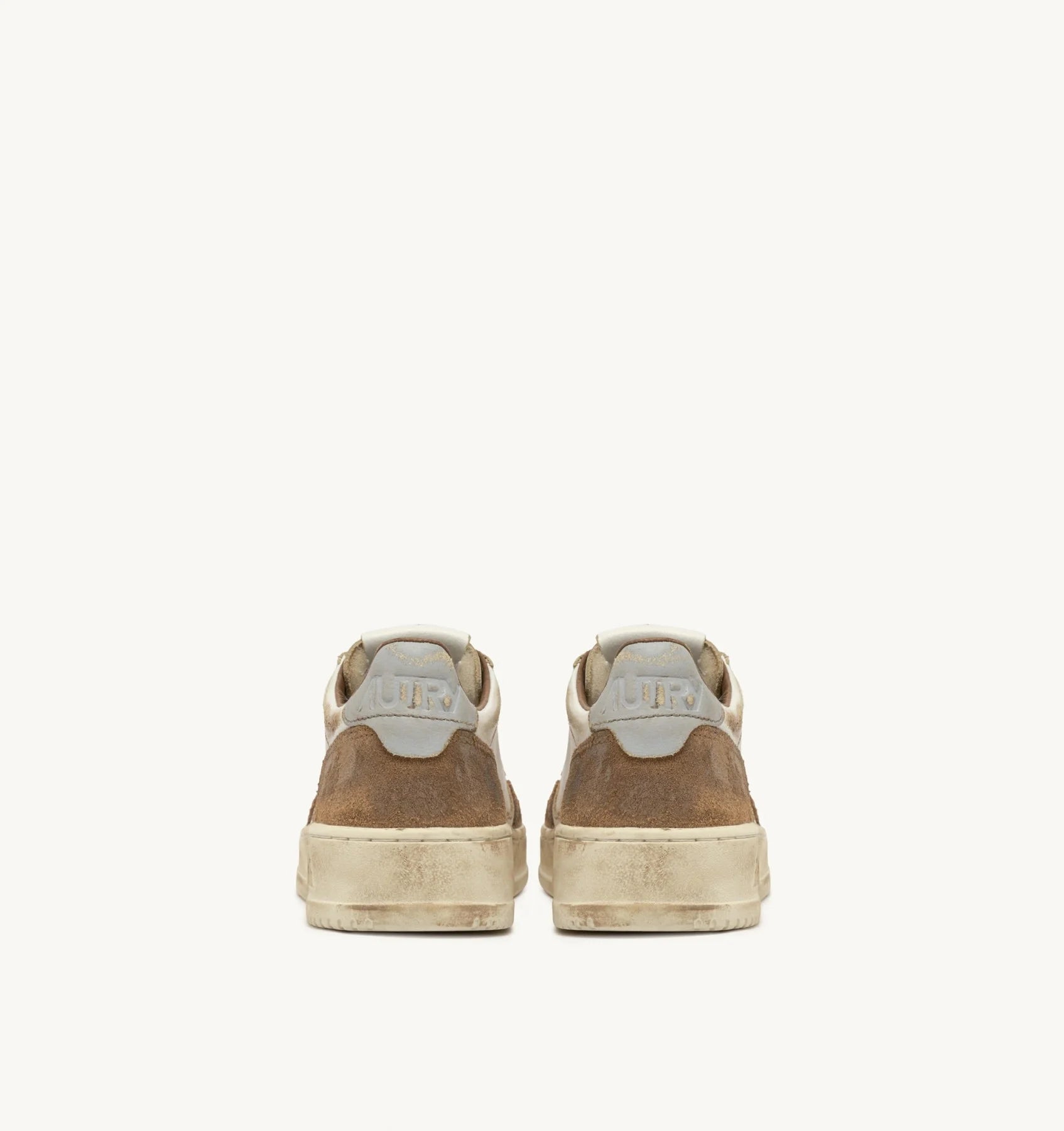 Zapatilla deportiva para hombre un aspecto verdaderamente único. Fabricada en piel blanca, con detalles de ante color coñac y un parche trasero de piel gris con el logotipo grabado.El acabado efecto barro realza tanto la parte superior como la suela. Cuello acolchado, puntera microperforada y detalle del logotipo de Autry en el lateral.