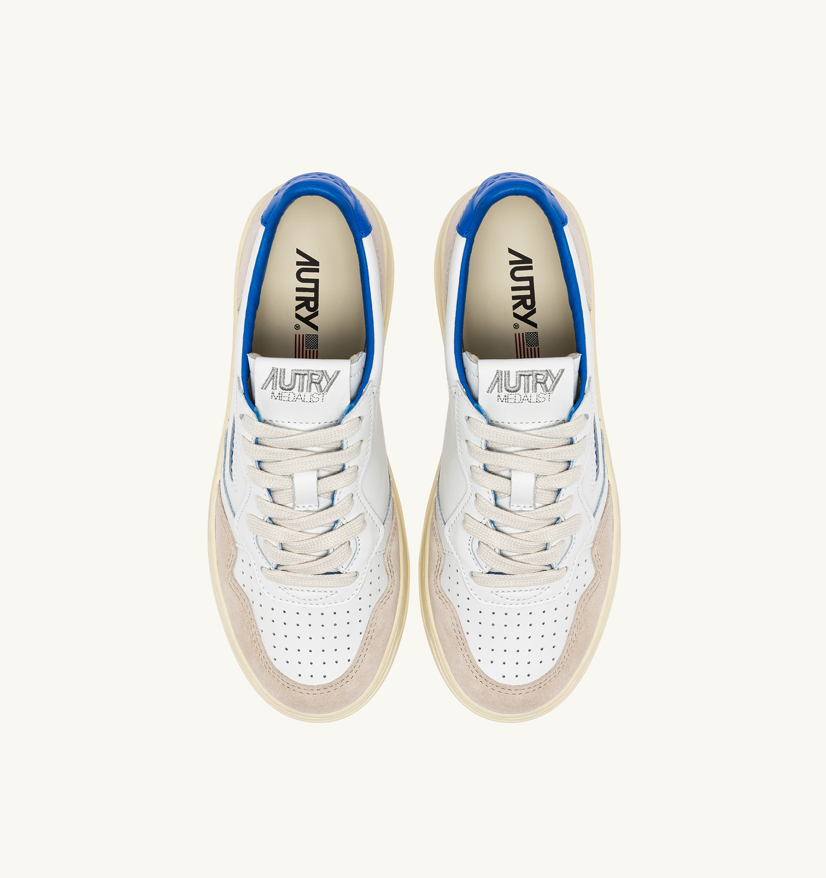 Las Medalist Sneakers de Autry son el calzado perfecto para hombres que buscan un diseño deportivo con un toque gráfico único. Estas zapatillas están confeccionadas en piel blanca de alta calidad, complementadas con detalles en azul y beige que añaden un aire audaz y moderno. Inspiradas en el tenis de los años 80, combinan un diseño clásico con un estilo gráfico contemporáneo.