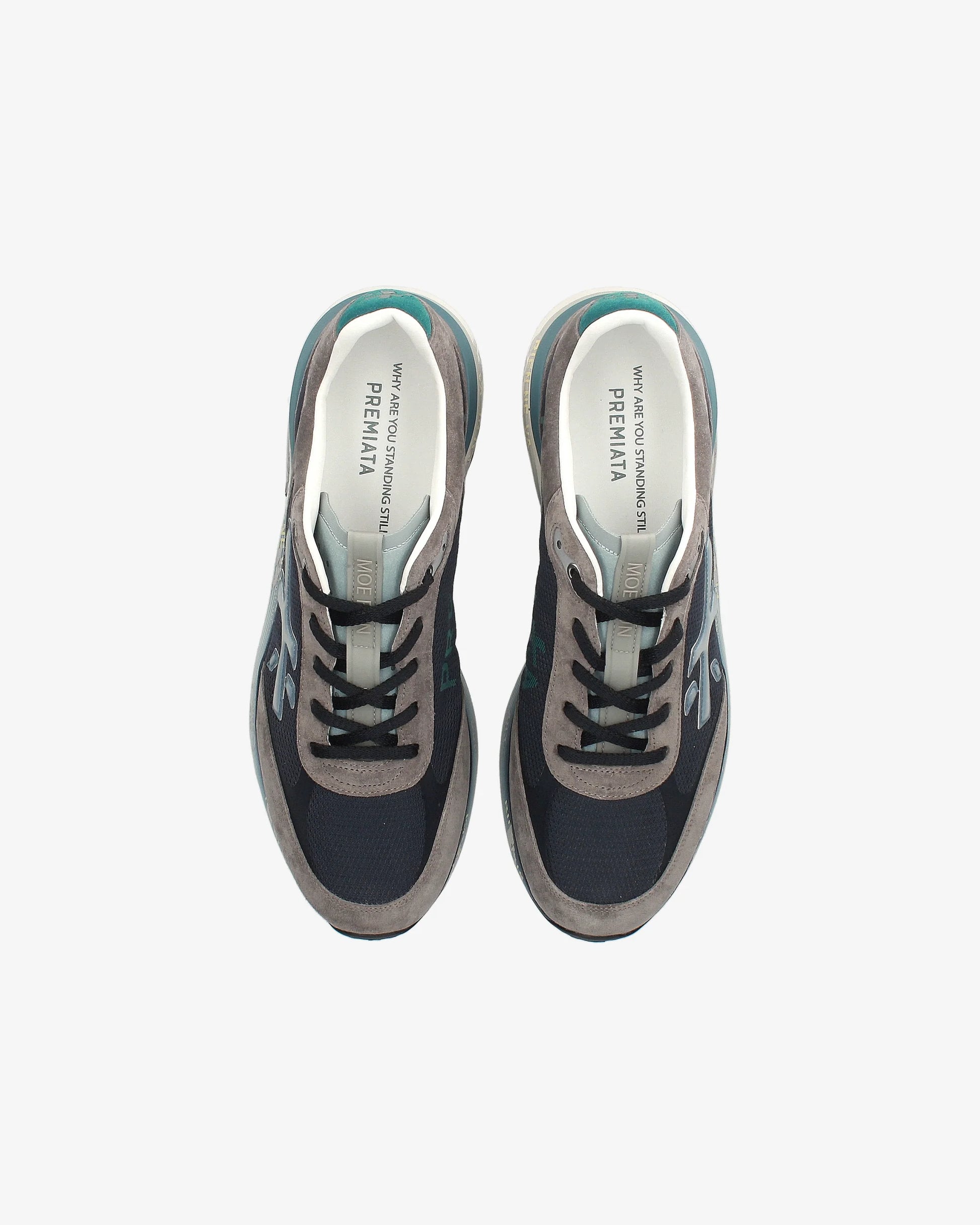 Las Premiata Moerun 7772 combinan el legado deportivo de la marca con una visión moderna del calzado urbano. Su silueta running se presenta en una sofisticada mezcla de materiales: ante gris, malla técnica negra y acentos en azul que aportan dinamismo y contraste.